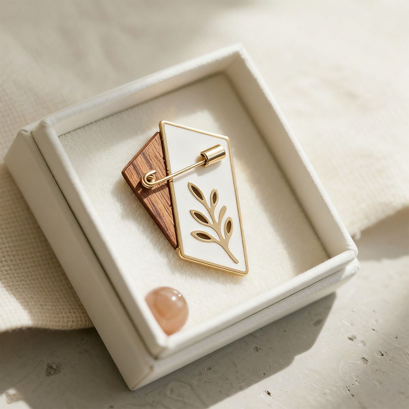 Elegancka drewniana broszka z pozłacanymi żyłkami liści
